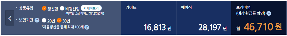 20년 납보다 30년 납의 보험료가 더 높았고, 자동갱신을 통해 100세까지 보장이 가능하다.