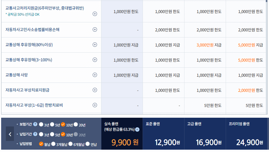 삼성화재 다이렉트 운전자보험은 실속플랜 표준플랜 고급플랜 그리고 41개가 보장되는 프리미엄플랜까지 4가지로 나누어 가입이 가능하다. 운전자 보험 다이렉트