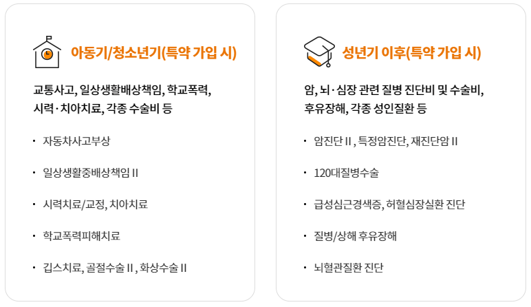 소아 시기에 잘 생기는 주요 질병, 상해, 독감, 아토피, 응급실 진료에 대한 보장들이 이루어지고 있다.